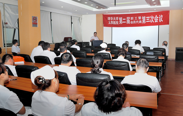 2012年7月31日下午在妇产中心七层会议室召开玉泉医院第二届三次职代会,参加会议的有院领导、职代会代表、工会委员、特邀代表等72人参加了会议。会议由工会主席潘淑琴主持,并汇报了职代会筹备情况及到会人数;基建处萧凯汇报医院门诊综合楼的建设情况;财务处长陈岩汇报医院财务工作情况;提案工作组副组长夏阳汇报上一期提案的落实情况;党委书记赵雨东对我院与中信合作方案进行详细说明;左焕琮院长谈我院与中信医疗健康产业集团有限公司合作建立妇儿医院的意义;职工代表对妇产中心与中信合作方案进行提问讨论,举手表决我院与中信合作方案。