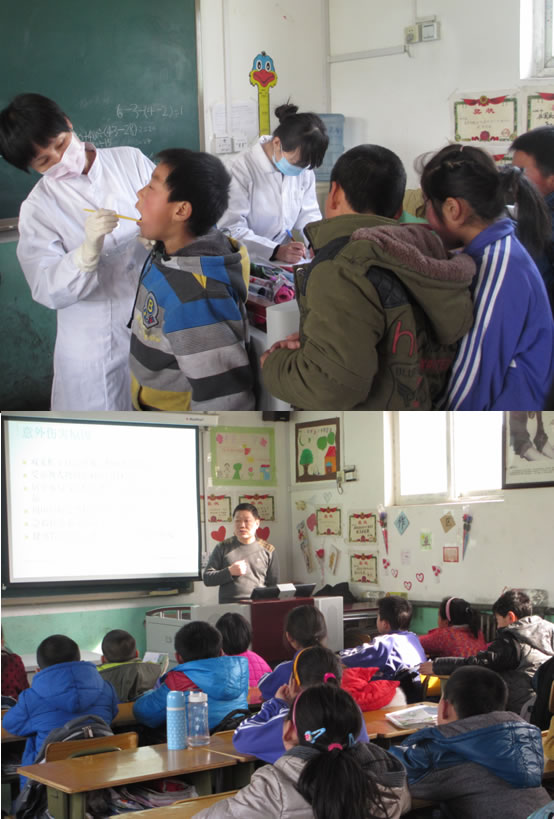 本次活动以主题班会的形式开展,清华大学玉泉医院志愿者为小学生们进行了《突发危险状况自救》、《姿势对脊椎的影响》、《健康饮食习惯的养成》、《正确用眼习惯》等主题健康宣教课程。口腔科医师对孩子们进行了口腔体检,眼科医师和护士对孩子们进行了视力体检及眼科基础疾病检查。内科医师对孩子们进行了内科检查,除外呼吸道疾病及心脏是否有异常情况,骨科医师检查孩子们肢体、脊柱是否存在异常,志愿者还辅导孩子们进行心理量表填写,将对孩子们的身心健康情况进行后续追踪,关心孩子们的健康成长。