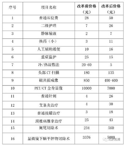 如普通床位费从现行28元调整为50元,二级护理从7元调整为26元,阑尾切除术从234元调整为560元,针灸从4元调整为26元等。