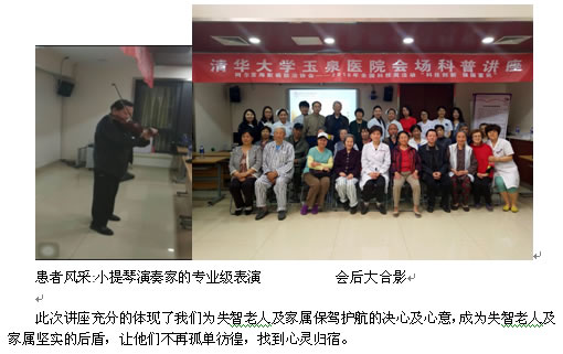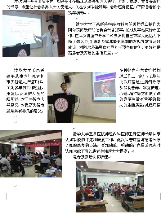 根据科技部、中央宣传部、中国科协、阿尔茨海默病防治协会、国际老年痴呆协会中国委员会、北京老年痴呆防治协会关于开展“2018年全国科技周”活动的通知,为关心阿尔茨海默病的社会大众提供专业科普服务,普及科学知识,弘扬科学精神,提高大众科学素养,更好地普及宣传预防老年痴呆的基本知识,传播科学的生活方式,使“关爱健康、防治痴呆”的理念更加深入人心, 2018年5月21日由阿尔茨海默病防治协会主办、清华大学玉泉医院神经内科承办主题为“科技创新 强国富民”的痴呆健康知识讲座在清华大学玉泉医院举办。参会者有护理工作者、病人及病人家属、社会志愿者、老年临终关怀机构工作人员参加了讲座。