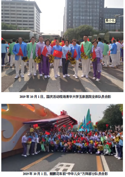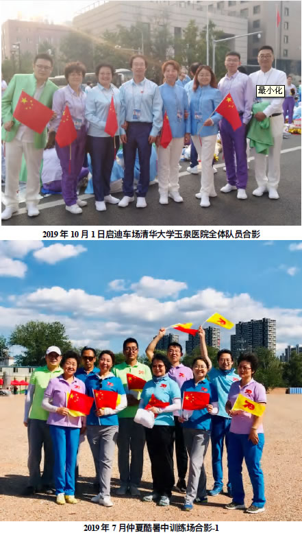 2019年的夏末秋初,非同一般,我们接到无缘神圣的光荣任务,代表清华大学玉泉医院参加中华人民共和国成立70 周年的庆祝活动。经过近 3 个⽉仲夏酷暑中的刻苦训练,我们(清华⼤学⽟泉医院郑红霜、杜洪涛、郭静、张洪霞、杨会霞、董晶、武晋廷、樊振全、郭建雄、宋佳良 10 位队员)与来自石景山区各个单位的同志们历练成牢不可破的生命共同体。