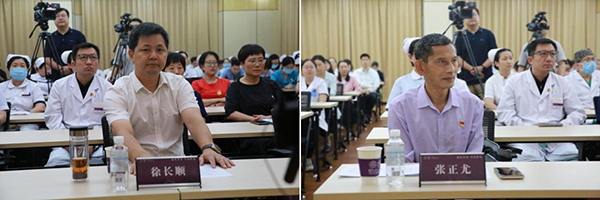 北京市卫生健康委二级巡视员徐长顺、北京市卫生健康委宣传处三级调研员张正尤认真聆听宣讲