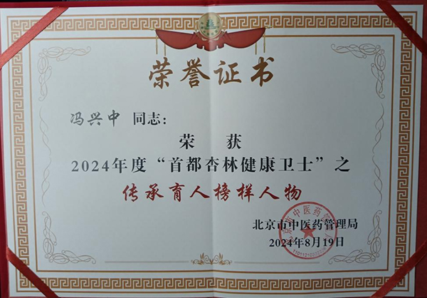 在北京市中医药管理局组织的2024年度“首都杏林健康卫士”评选及“改善医疗服务优秀案例”征集活动中,我院李步满、贾育松分别荣获文化传播优秀案例和学术融合优秀案例,冯兴中荣获2024年度“首都杏林健康卫士”之传承育人榜样人物称号,季杰荣获2024年度“首都杏林健康卫士”之区域协同榜样人物称号。