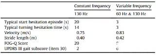 表1.患者在连续刺激和变频刺激下的步态分析结果。