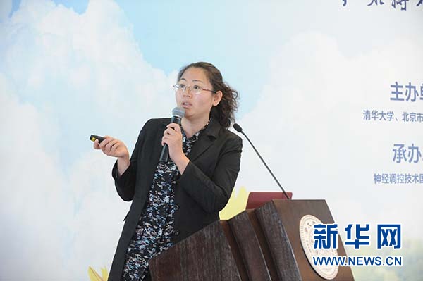 2016年4月9日,第五届清华脑起搏器论坛“爱人如己,启搏希望”世界帕金森病日关爱活动在清华大学启动。图为玉泉医院马羽主任讲解变频刺激的临床进展。