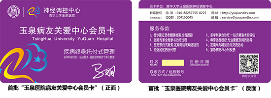 清华大学玉泉医院神经调控中心“玉泉医院病友关爱中心会员卡”,首次将疾病终身托付落于实体,将服务明细落于纸上,会员中心承诺为持卡回院提供一对一的多项服务,全程为患者身心健康保驾护航。具体服务条款: