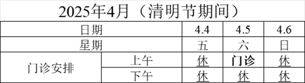 根据国家法定假期规定,并结合我院具体情况,现对2025年清明节门诊做如下安排: