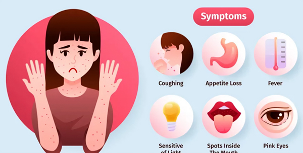 麻疹是由麻疹病毒引起的急性呼吸道传染病,其典型症状包括高热、咳嗽、流涕、眼结膜炎、口腔麻疹黏膜斑及皮肤斑丘疹等。该病主要通过呼吸道飞沫传播,也可通过接触被污染的物品间接传播,传染性极强,易感者接触后90%以上可发病。