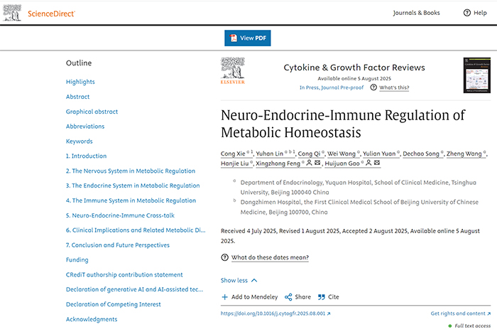 近日,清华大学玉泉医院(清华大学中西医结合医院)内分泌科研究团队在代谢病调控机制研究方面取得新进展,相关综述论文以《Neuro-Endocrine-Immune Regulation of Metabolic Homeostasis》为题,发表在国际医学期刊Cytokine and Growth Factor Reviews(IF = 11.8)上。
