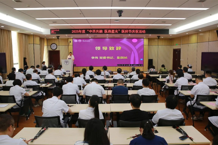 活动伊始,李伟致开场辞。他代表医院党委和领导班子向全体医师致以节日祝贺与崇高敬意。李伟书记在讲话中深入阐释了“中西共融、医路星光”主题的深刻内涵。他指出,“中西共融”是医院的立院之本、强院之魂,是两种医学智慧的碰撞交融,“医路星光”是对医者职业精神的礼赞。一年以来,全院在多师共管联合诊疗、科研项目的传统与现代结合、临床路径融入中医适宜技术等方面不断探索,开设了多师共管减重门诊、青少年心理门诊等多个联合门诊,举办了数十场健康日义诊咨询,临床科研上也收获颇丰。医师们以专业力量、坚守身影和生命温度,在医路上点亮光芒,冯兴中院长、贾育松主任等一批先进个人就是其中的代表。二者共同彰显了医学服务于人的核心价值。