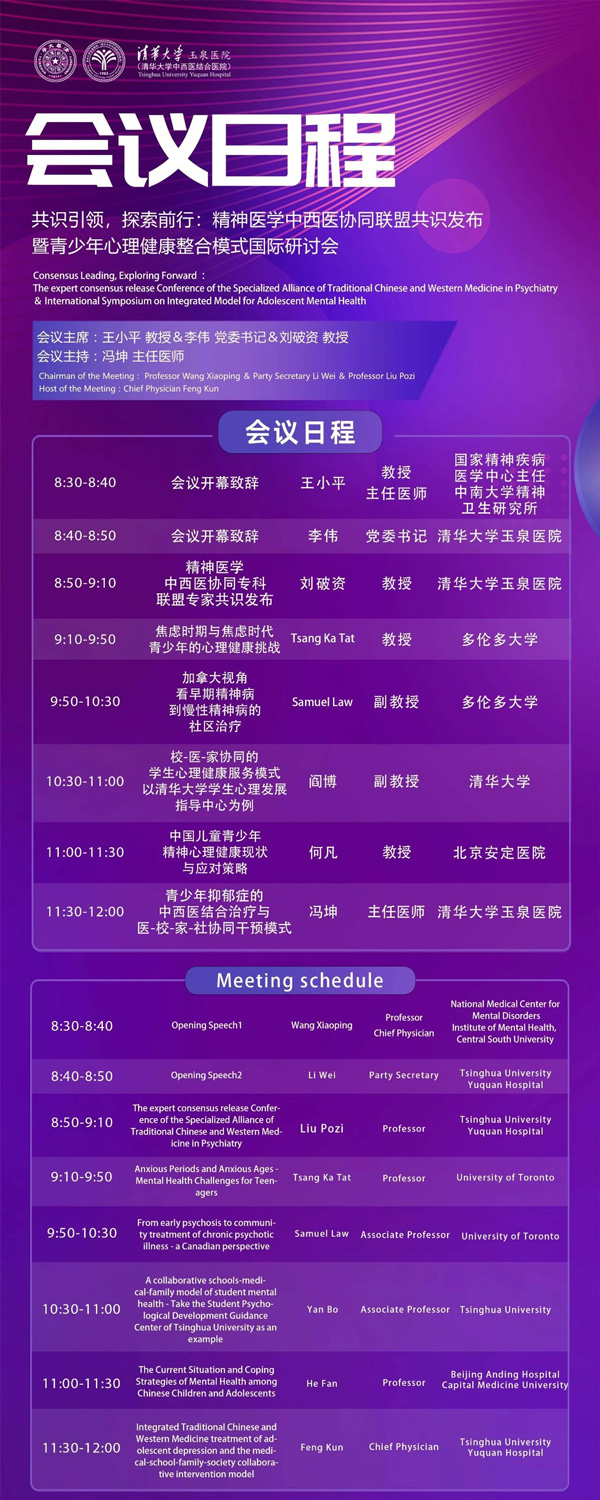 为进一步推动精神医学专科中西医协同综合诊疗模式的进步,发挥精神医学中西医协同专科联盟的带头作用,完善精神医学中西医协同工作的框架及内容,对接青少年心理健康整合模式的国际化视野,扩大我国在国际精神医学及心理学领域的影响力,由清华大学玉泉医院(清华大学中西医结合医院)主办的“共识引领,探索前行:精神医学中西医协同联盟共识发布暨青少年心理健康整合模式国际研讨会”将于2025年9月23日在中国北京召开。本次会议将围绕“共识引领,探索前行”的主题,邀请精神医学相关领域的中外知名专家,首次发布精神医学中西医协同联盟共识,并就青少年心理健康的整合模式细节开展深入的交流与探讨,旨在推动精神医学的国际化沟通与变革发展。现将有关事项通知如下: