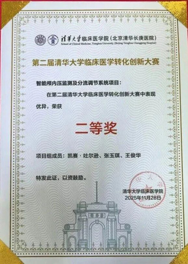 近日,第二届清华大学临床医学转化创新大赛圆满落幕,清华大学玉泉医院(清华大学中西医结合医院)张玉琪教授带领的团队(团队成员:王俊华、凯赛·吐尔逊)凭借自主研发的“智能颅内压监测及分流调节系统”脱颖而出,斩获二等奖殊荣。该成果以临床需求为核心,实现颅内压监测与分流治疗的智能协同,彰显医院在神经外科高端医疗设备创新领域的硬核实力。