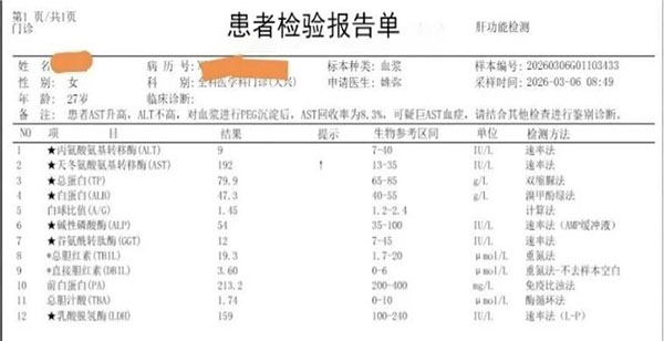 患者女性,27岁,于2026年2月11日体检发现谷氨酰转肽酶结果为156U/L(正常值范围是男性11~50U/L,女性7~32U/L)。2月28日外院查谷氨酰转肽酶结果为207U/L,其余肝功能指标无异常门诊。患者平素体健,无肝炎、结核病史;无心脏、血液系统疾病史;无服用损伤肝细胞药物病史;近期无外伤及剧烈运动史,查体未发现阳性体征。入院后给予保肝降酶治疗两天后复查,谷氨酰转肽酶165U/L、总胆固醇5.23mmol/L,其他肝肾功能、心肌酶谱、甲功指标未见异常;甲、乙、丙、戊型肝炎血清学指标未见异常;巨细胞病毒、EB病毒抗体未见异常;自身免疫性抗体、免疫球蛋白监测未见异常。肝胆胰脾彩超未见异常。外院行聚乙二醇沉淀试验回收率8.3%(AST 16U/L),支持巨酶血症诊断。
