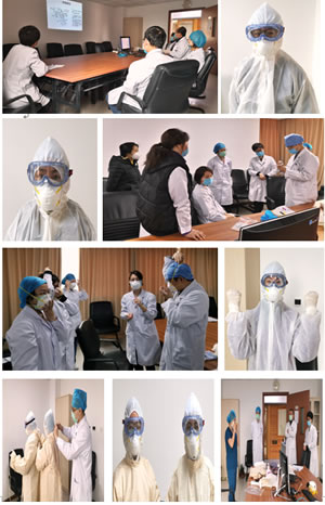 本次培训采用了线上和线下相结合的培训模式。线上模式为通过组建微信群,线上学习新型冠状病毒肺炎诊疗方案(试行第六版),观看北京地坛医院防护用品穿脱程序视频,以及学习流行病学调查应知应会52条(自编)等材料,要求每位队员充分熟悉相关知识内容,有问题微信群内随时提问和解答。线下培训为2月24日上午集中现场培训,负责培训的有周荣慧、郑永刚、王建斌、张庆琳等老师。培训继续了以前小班培训和一对一的演练模式,针对不同的队员进行了个性化讲授,并就队员们关心的具体问题,比如取咽拭子的技巧、进行户外和入户调查时的防护装备,进行了不厌其烦地深入讲解和细致入微指导(例如如何在穿着羽绒服、鞋、眼镜后穿戴防护装备等注意事项)。培训中老师们反复强调了戴口罩时的密合试验,摘口罩时防飞溅,脱隔离衣时注意卷脱、动作轻揉,严格手卫生等注意事项,力争通过悉心讲授,将最安全的规范流程传递给每一位队员。