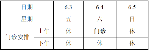 6月3日到6月5日三天上午门诊(8:00-11:30),下午急诊(11:30-4:30)。