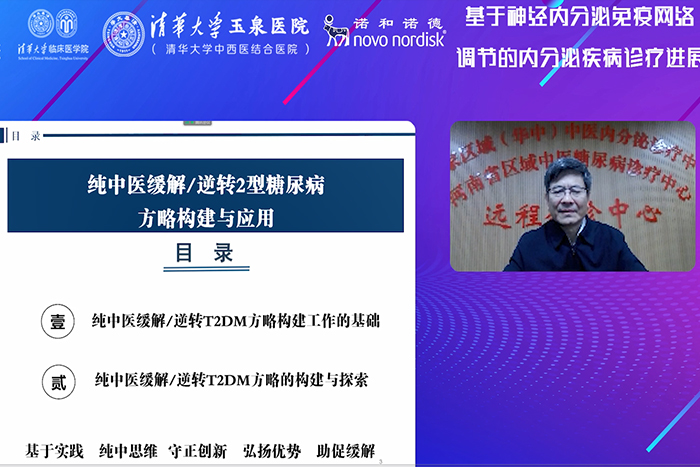 开封市中医院庞国明教授基于中医思维和临床应用,提出三辨诊疗模式,即辨病、辨证、辨体,庞教授应用三辨诊疗模式治疗2型糖尿病疗效显著,明确指出中医在缓解/逆转2型糖尿病中具有突出优势。厦门市糖尿病研究所杨淑禹教授介绍了糖尿病防治的另一个理念,提出专科医师、全科医师(中医师)、健康管理师组成“三师共管”的诊疗模式。北京中医药大学东方医院张涛静教授围绕筛查、诊断、评估等方面讲解了代谢性疾病相关肾损害的中西医结合诊治。我院健康管理中心(治未病)主任李步满教授强调中医“脾”与神经内分泌免疫网络的密切关系,提出以“燮理中焦脾胃,调节气机升降”作为治疗疾病的基础和金钥匙。