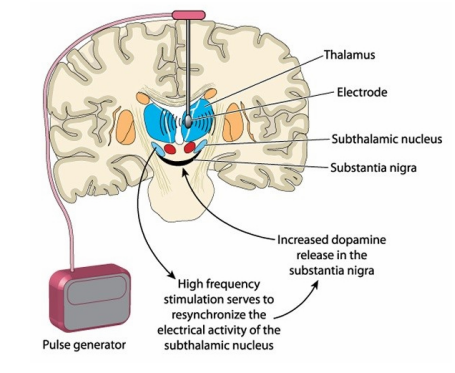 DBS亦即深部脑刺激(deep brain stimulation),又称为脑深部电极植入术,原理是通过植入大脑中的电极发放高频电(通常大于等于130赫兹)刺激到控制运动的相关神经核团(苍白球内侧部 -GPi、丘脑底核 -STN 等),电刺激信号会干扰异常神经电活动,将运动控制环路或紊乱的神经递质恢复到相对正常的功能状态,从而达到减轻患者运动障碍症状、提高生活质量的目的。