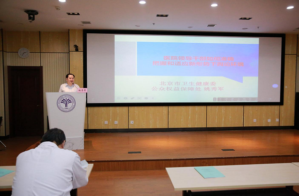 5月11日下午,我院在A楼2层报告厅举办年度中层干部教育培训(第七讲),北京市卫生健康委公众权益保障处处长姚秀军以“医院领导干部如何准确把握和适应新形势下舆论环境”为主题主讲培训。党委副书记、纪委书记王斐主持培训,医院领导班子成员、党委和纪委委员、中层干部、党支部宣传委员等参加培训。