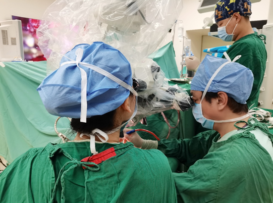 手术室内,麻醉科、神经外科、妇产科和神经电生理室医护人员精心准备,高效、无缝衔接。当日9点,麻醉科完成静脉通道开放,做好全麻准备;9点15分,神经外科在局麻下完成脑室穿刺置管外引流术;9点22分,妇产科行剖宫产术;9点25分,顺利剖出一例女婴,哭声响亮,呼吸心跳正常;10点,关腹完毕。随后,张玉琪教授团队开始行颅内肿瘤切除术,妇产科主任王艳琴全程守护。患者肿瘤体积巨大、血运丰富,毗邻脑干及重要血管神经,手术难度巨大,张玉琪教授主刀,在显微镜下经历了漫长的4个小时,最终将肿瘤全部切 。得知手术成功,家属无比激动,不断向医护人员表达感谢。