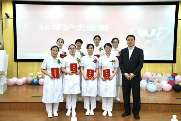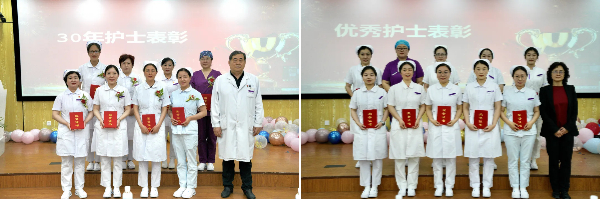 医院副院长冯兴中宣读了表彰人员名单。院领导为院级优秀护士、30年护龄的护理人员颁发荣誉证书,激励全体护士继续发扬爱岗敬业、比学赶超、积极进取、勇于奉献的职业精神。